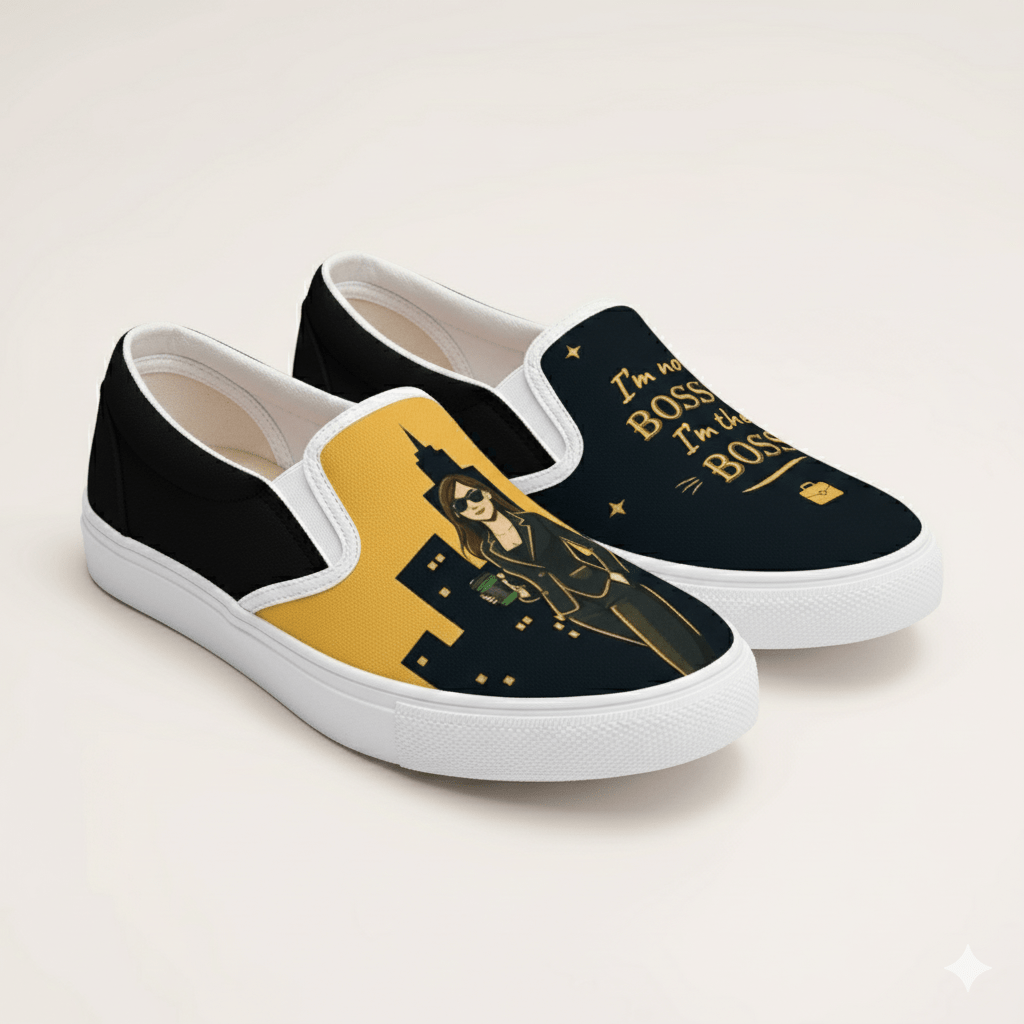 Step into confidence with these bold slip-ons that announce your authority in style. Featuring the empowering "I am the boss" design, they're perfect for anyone ready to own their space—whether at work, on the streets, or anywhere you need to make a statement. Comfortable, eye-catching, and unapologetically you.